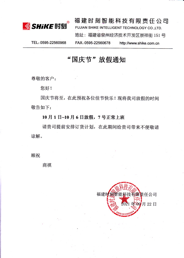 國(guó)慶節(jié)將至,福建時(shí)刻智能科技全體同仁祝福各位節(jié)日快樂!同時(shí)也希望貴司一如既往地給予我司惠顧與支持,雙方共創(chuàng)互利共榮新局面!