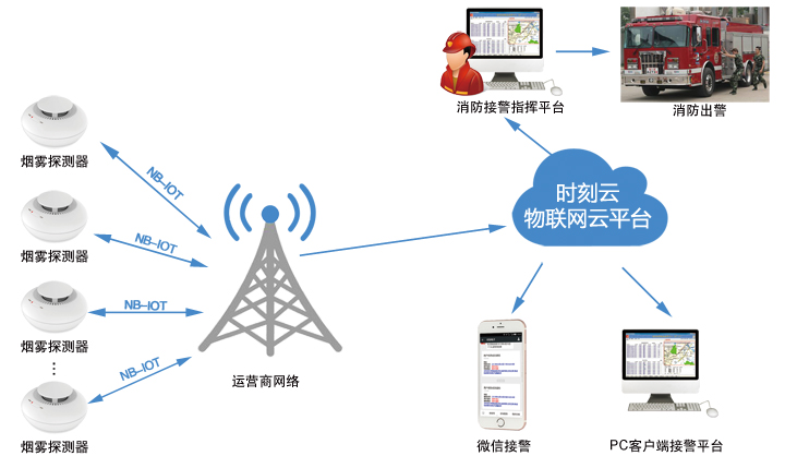聯(lián)網(wǎng)報(bào)警:采用最新NB-IoT通信技術(shù),遇到煙霧主機(jī)現(xiàn)場(chǎng)高分貝報(bào)警、同時(shí)報(bào)警信息上報(bào)微信或聯(lián)網(wǎng)報(bào)警中心平臺(tái)